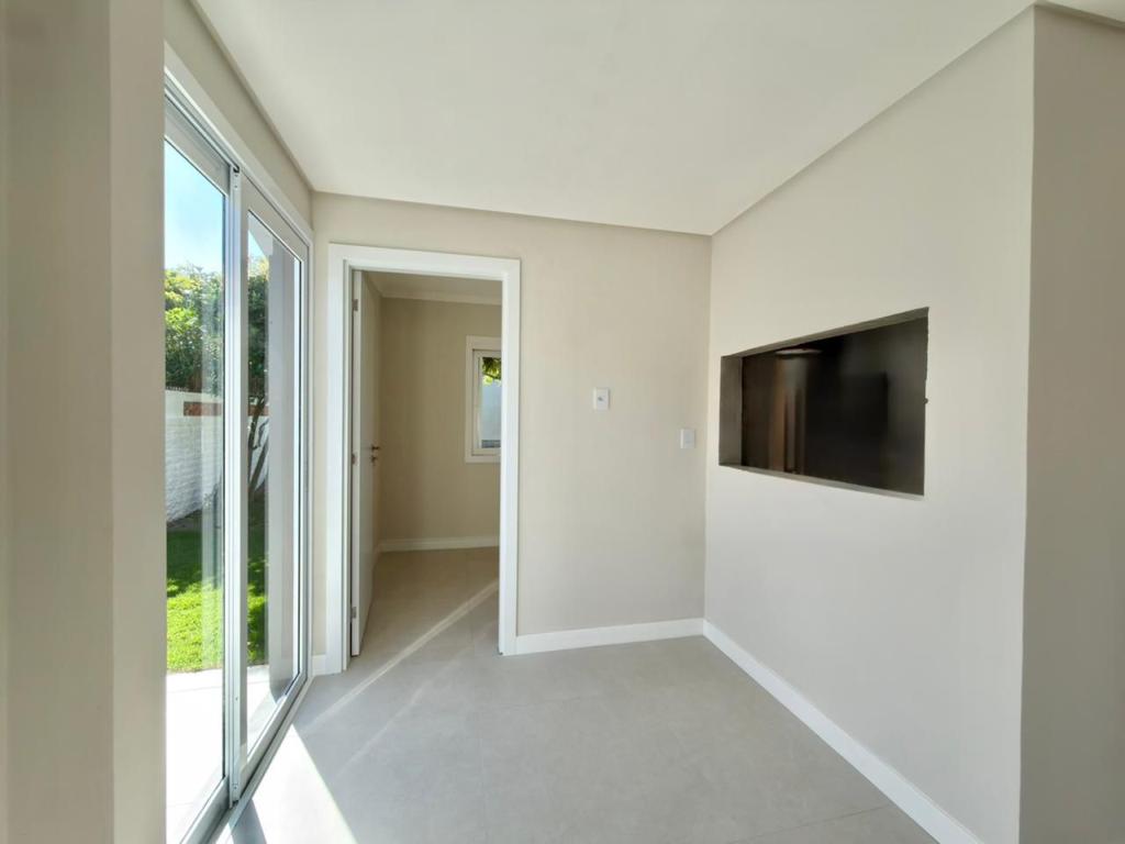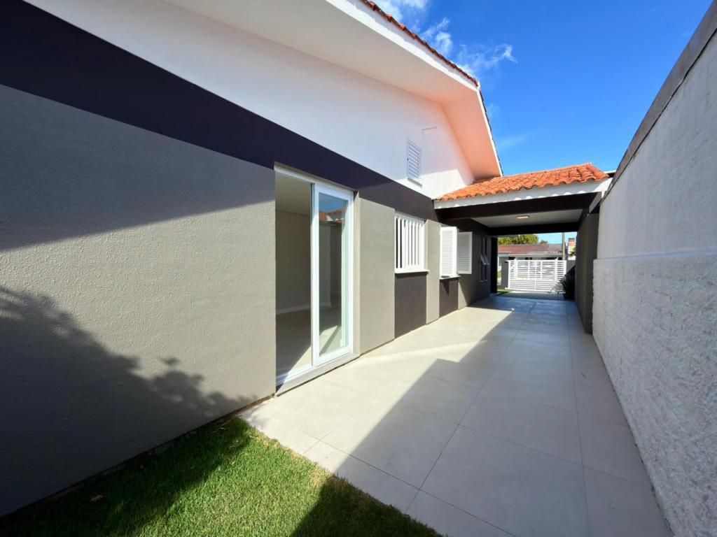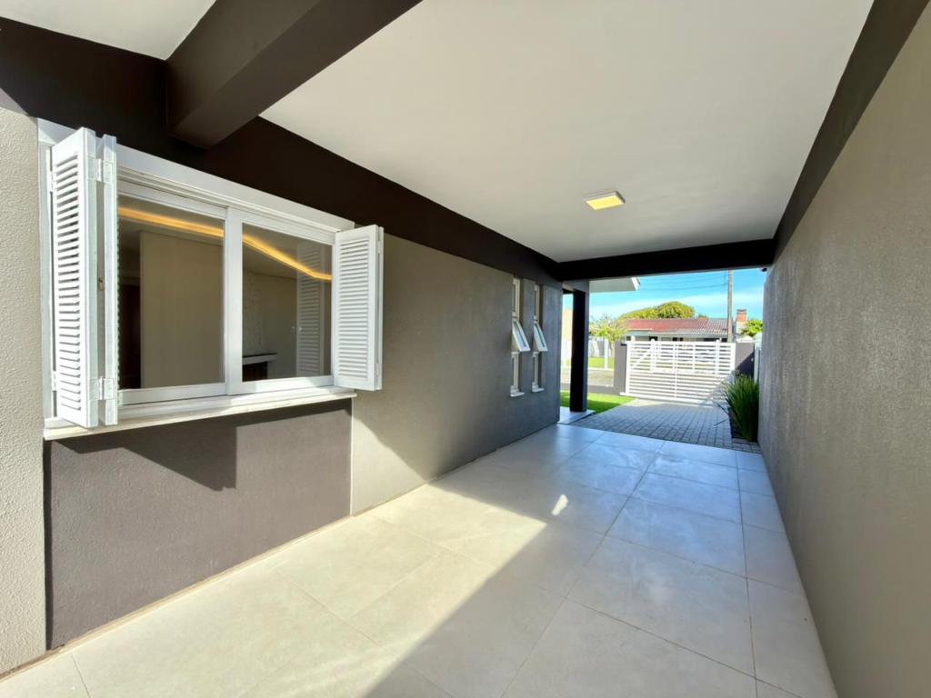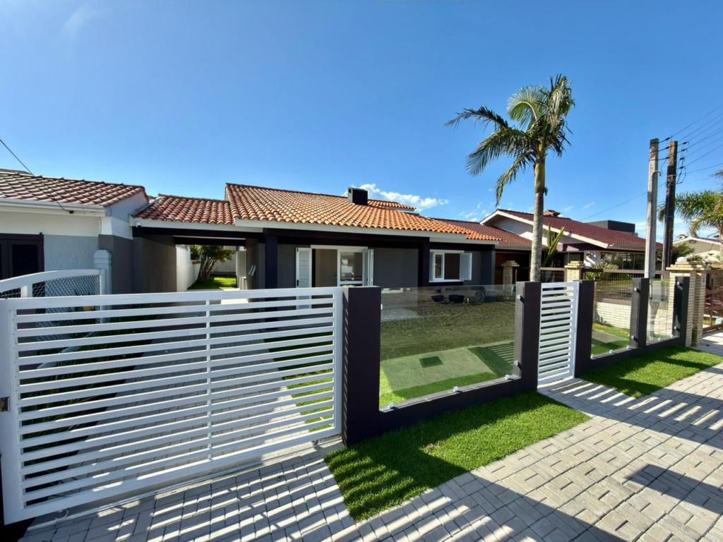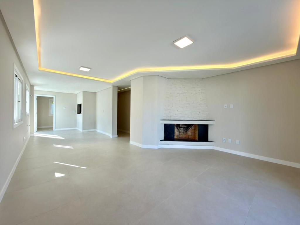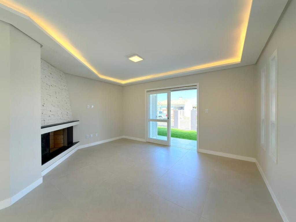 , forro em laje, com iluminação, 3 dormitórios sendo 2 suítes, livin 3 ambientes rebaixado em gesso, lareira a lenha, cozinha americana c/ churrasqueira tubulação para água quente, banheiro social, ampla área de serviço, amplo pátio (12x 32,5), garagem coberta para carro, divisa com Atlântida.