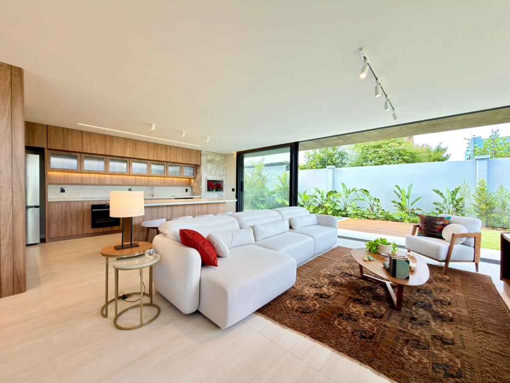 - O living em 3 ambientes integra sala de estar, jantar e espaço de convivência, criando um ambiente amplo, moderno e acolhedor.